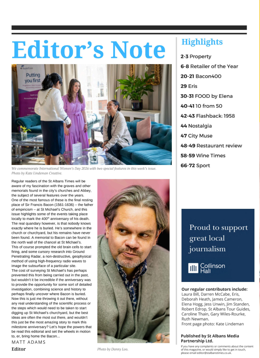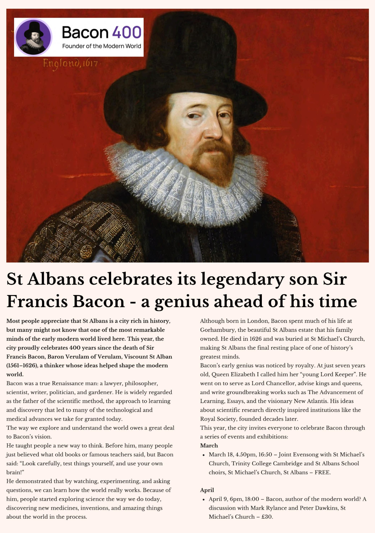 2026 marks the 400th anniversary of the death of Sir Francis Bacon, one of history’s greatest philosophers, scientists, and statesmen. As his home and final resting place, St Albans will be the focal point for global commemorations, featuring lectures, exhibitions, and community activities that celebrate his enduring legacy.